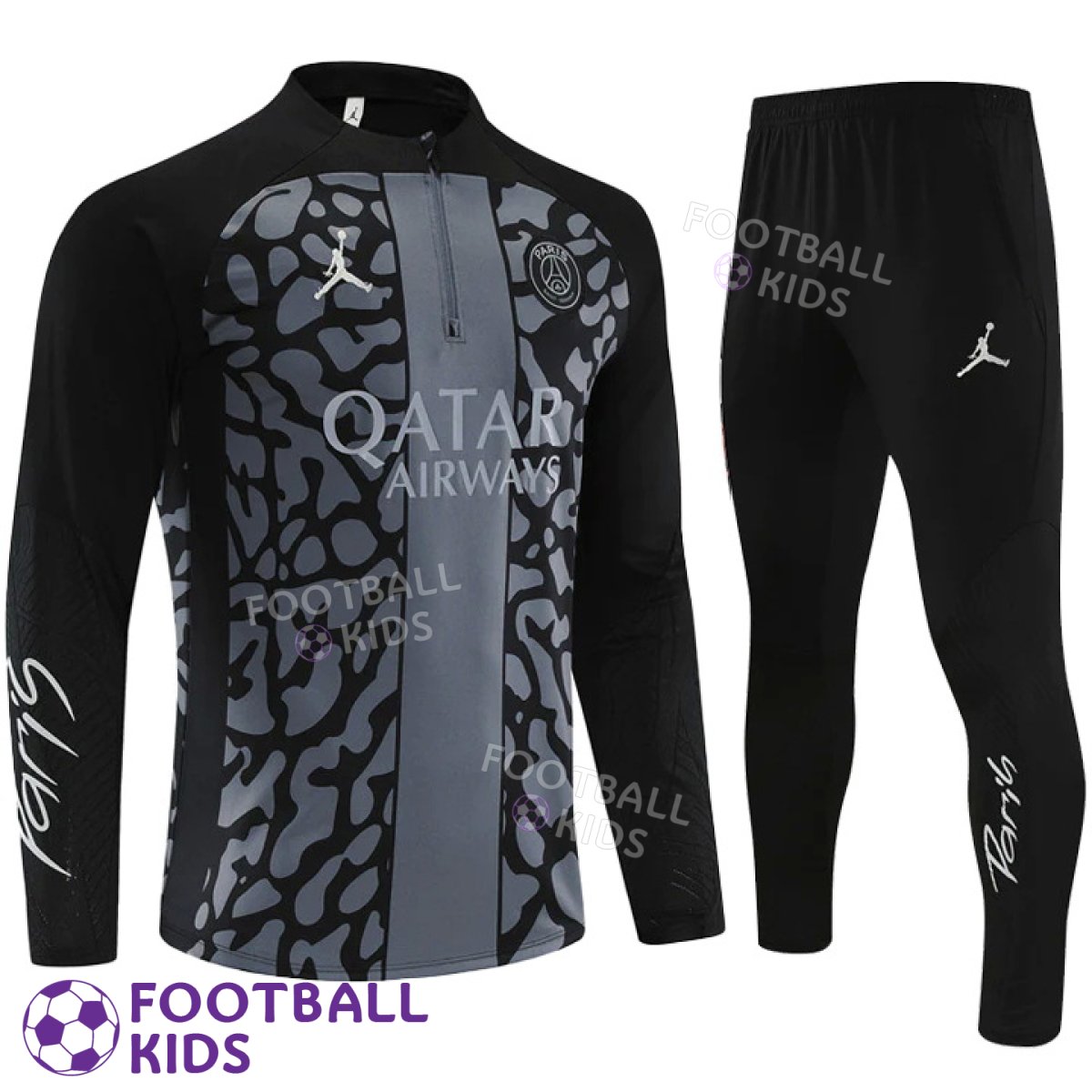 Современный дизайн тренировочного костюма PSG Jordan Black/Grey 2023-2024 для детей: